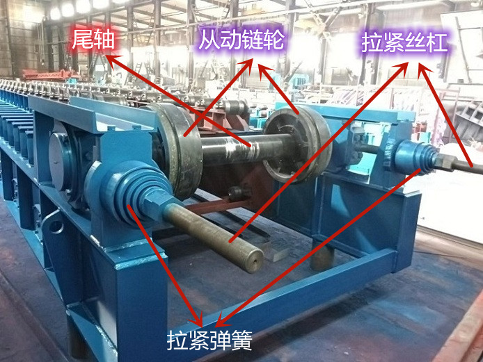 主要由从动轴、两个从动链轮、轴承、轴承座,拉紧弹簧及拉紧螺杆等组成。链轮是通过涨紧套固定在轴上,轴的两端装有双列调心滚子轴承和轴承座。轴承座装在机架两侧,并在滑轨之间前后滑动。