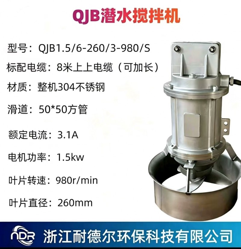 QJB1.5/6-260/3-980/S是浙江耐德尔环保科技有限公司自主研发生产的高速混合式潜水搅拌机,属于QJB系列潜水搅拌机的经典小功率型号。整机采用304不锈钢材质打造,专为中小型污水处理场景设计,可实现污水、污泥等介质的高效混合、防沉淀与推流,是市政、工业水处理项目的核心设备之一。